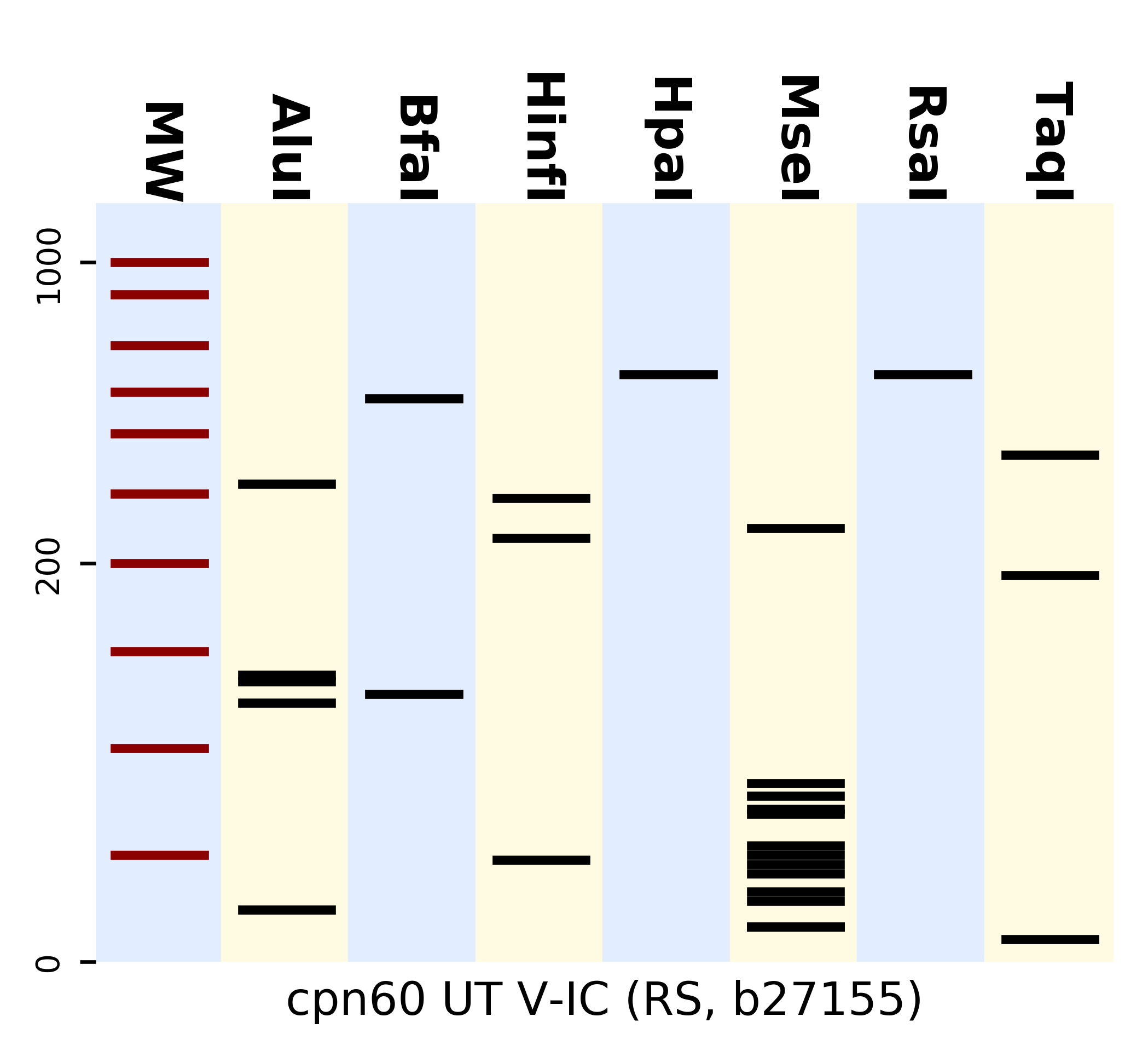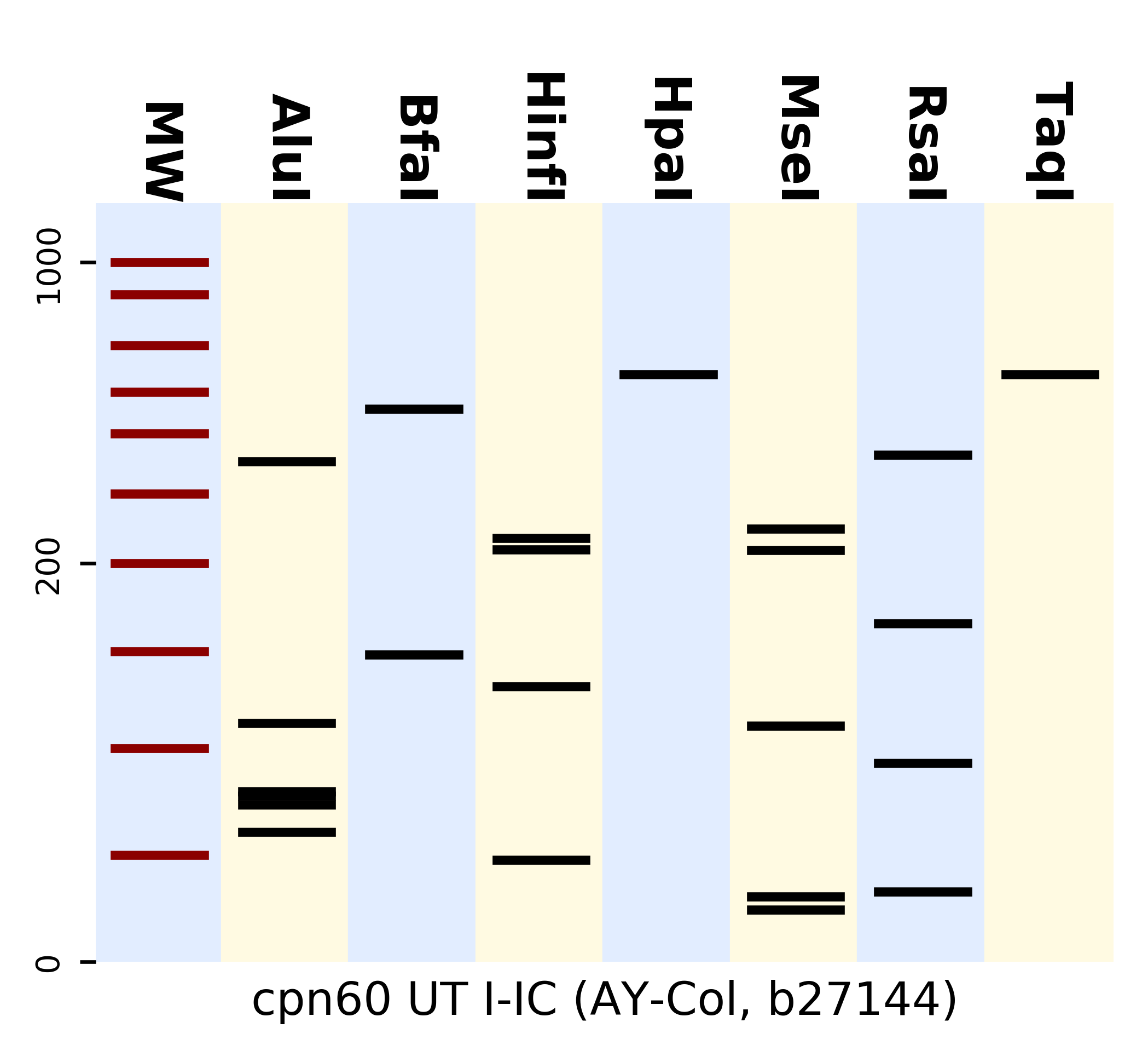 | I-IC | b27144 | Candidatus Phytoplasma asteris Aster yellows phytoplasma (AY-Col) | Number of Bands: 6 Band Sizes: [58,36,30,351,39,38] | Number of Bands: 2 Band Sizes: [455,97] | Number of Bands: 4 Band Sizes: [24,235,219,74] | Number of Bands: 1 Band Sizes: [552] | Number of Bands: 5 Band Sizes: [248,218,57,13,16] | Number of Bands: 4 Band Sizes: [362,46,17,127] | Number of Bands: 1 Band Sizes: [552] |